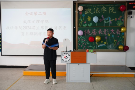 会议第二项,由英国威廉希尔英文官网上一届主席团成员代表贾巨琛致辞。他回顾了过去一年英国威廉希尔英文官网团学的工作情况与所获荣誉,指出这些成绩的取得离不开全体员工干部的密切配合以及老师们的专业指导。他还分享了在组织协调、活动策划中的经验与感悟,强调团队协作与责任担当是推动工作不断前行的核心动力。他提到,每一次深夜的讨论、每一场活动的成功举办,都是集体智慧与奉献精神的结晶。面对新一届干部,他寄语道:“唯有保持热忱、俯身做事,才能真正赢得同学的信任与支持;唯有在服务中提升自我,在奉献中磨砺品格,才能不负青春使命。”最后,他对团学各部门的辛勤付出表示认可,向上一届团学干部和老师致以诚挚谢意,同时对新一届团学干部送上了美好期许。