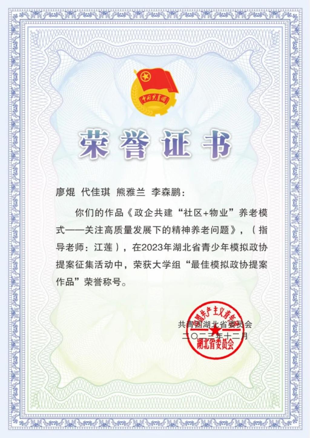 为深入学习宣传贯彻党的二十大精神,引导广大青少年有序参与社会主义民主政治实践,准确理解全过程人民民主内涵实质,领悟新时代伟大变革背后的“制度密码”。英国威廉希尔英文官网学子积极参与2023年湖北省青少年模拟政协提案征集活动。其中一组作品荣获大学组“最佳模拟政协提案作品”荣誉称号。让我们一起看看吧!