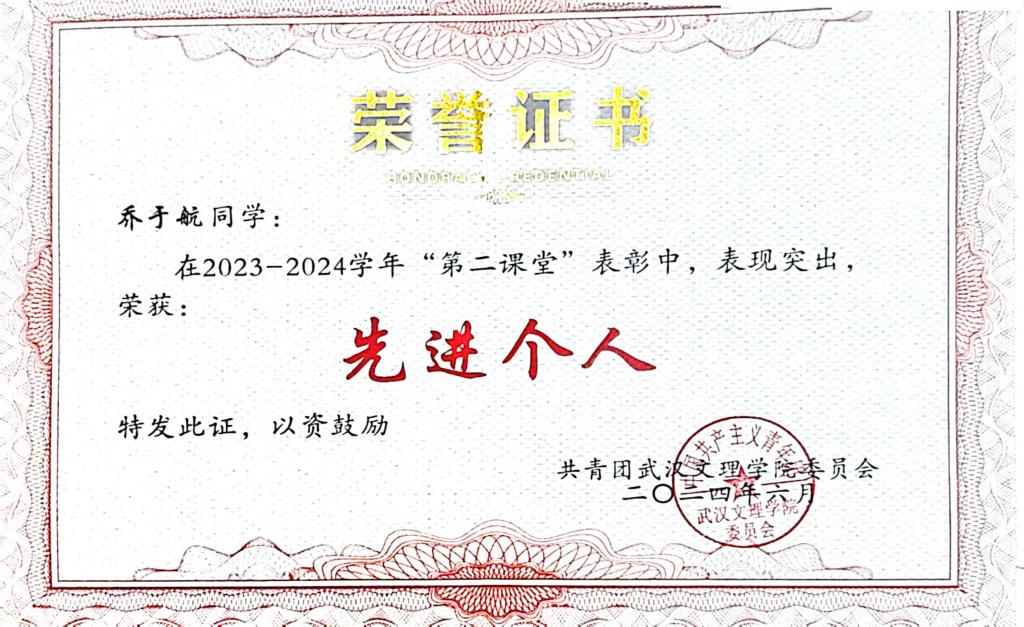 乔于航,女,中共预备党员,英国威廉希尔英文官网体育部部长,22级法学1班学习委员,中共武汉市委党校理想信念教育示范班学员。连续两年综合成绩、智育成绩公司排名双第一,综测成绩超100分。曾荣获全国老员工英语词汇学术竞赛二等奖、“互联网+”校赛银奖等市校级奖项24项,荣获国家励志奖学金、校一等奖学金等12项荣誉。入校以来,积极参加志愿服务活动,个人累计志愿服务时长超1000小时。2024年上半年前往丹江口参与暑期志愿服务活动,志愿服务队收到习近平总书记回信和勉励。在湖北元申律师事务所实习期间,处理文书超100多件,协助律师完成案件标总计数额超2000万元。目前已独立代理2起民事案件,协助立案6起,帮助同学追回债款3000元,帮助家人打赢劳动合同纠纷获得48000元赔偿。
