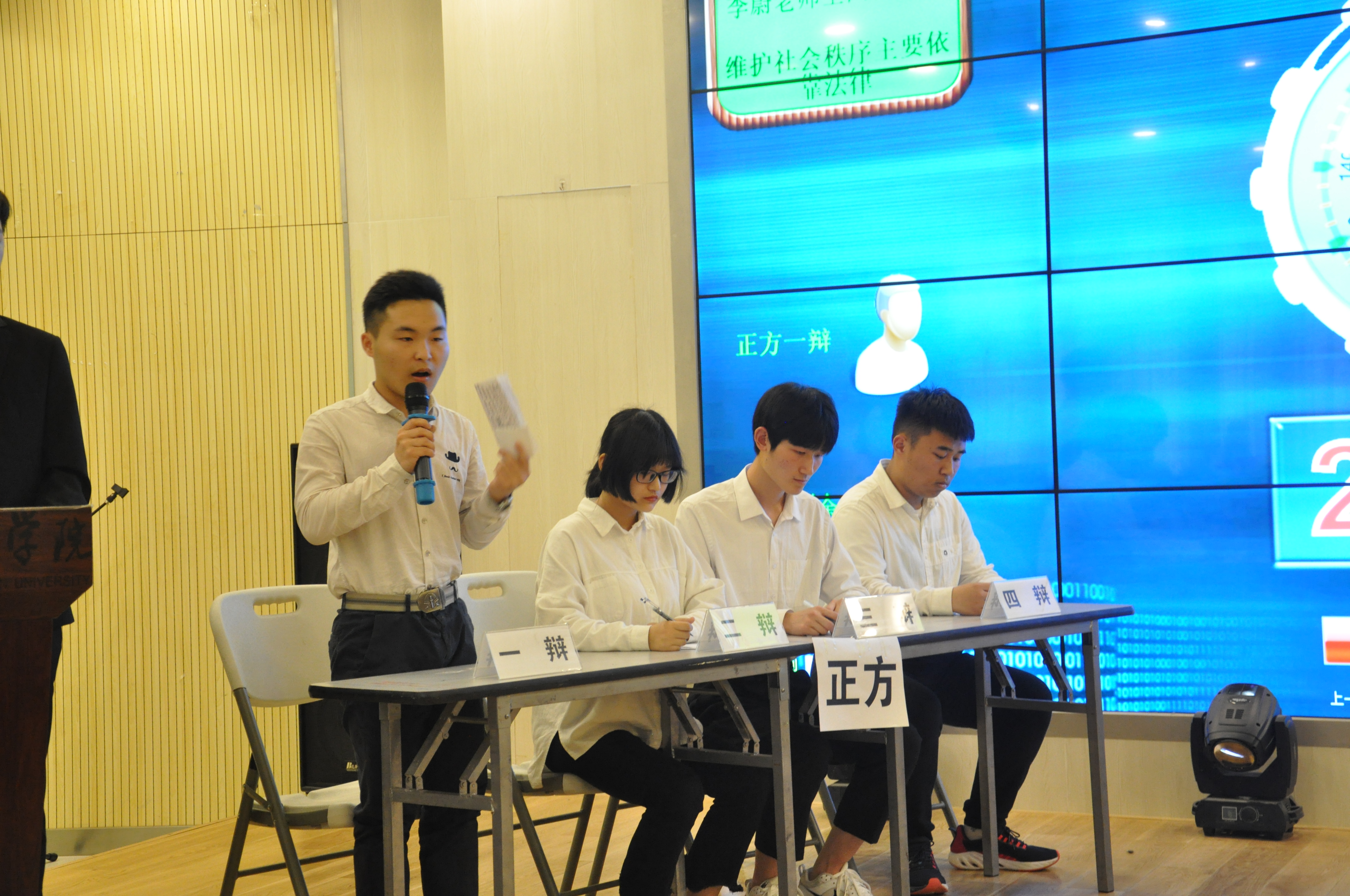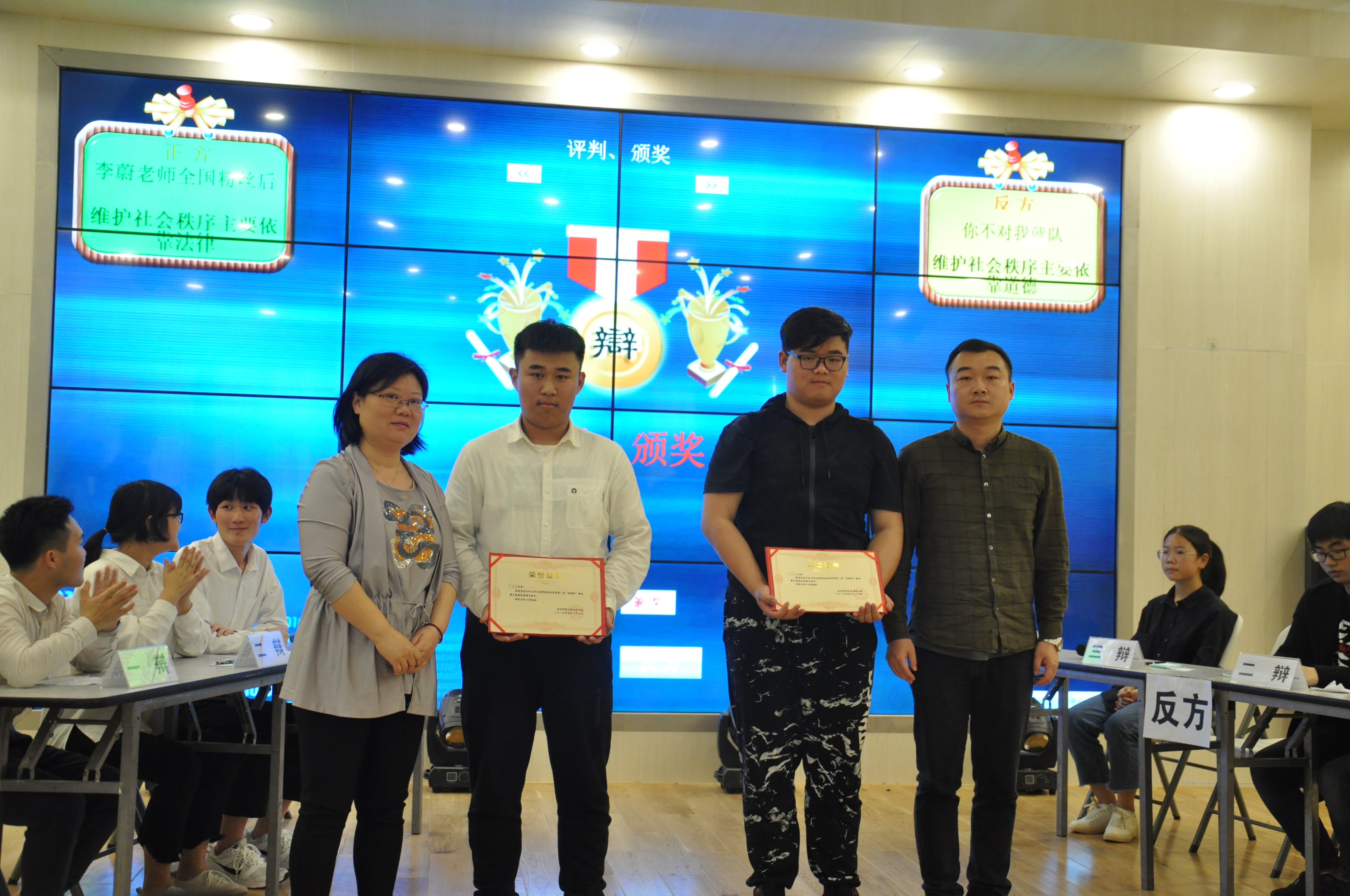 本次辩论赛的辩题为:社会秩序主要是依靠法律还是道德!正方“李蔚老师全国粉丝后援队”的观点为:社会秩序主要依靠法律;反方“你不对,我就队”的观点为:社会秩序主要依靠道德。双方就己方观点展开了激烈的辩论!首先,由正方一辩发言,进行开篇立论:法律保障和纠正的作用;历史发展的潮流表明道德作用弱化、法律作用强化;法与德的约束力问题及公信力的问题。接着由反方一辩发言:要辩证地分析道德和法律的作用,要看到两面性。不否认法律的作用,只是道德的作用更大,从道德的教化作用得到的体现等。正反双方一辩的开篇立论把论点阐释得井井有条。很快正方二辩发言,她首先是强化己方观点,认为法律是社会的最终导向,相较于道德更具有说服力,作用更大。紧接着反方二辩反驳对方提出的关于法律的保障和纠正问题,并从一些方面对法律的约束性效力提出质疑。进入小高潮部分,正方三辩以汶川地震为例,把英雄、高尚道德等道德判断联系起来辩证分析,对反方三、四辩盘问。反方三、四辩也临危不乱,抓住核心问题,将问题拉到道德的立场上来论证。接着反方三辩盘问正方三、四辩,他以道德问题就事论事,并提问道德与法律冲突时该如何选择。正方三、四辩也胸有成竹,在三辩的盘问中有条有理地阐释己方的观点,赢得满堂喝彩。经过紧张的一轮盘问环节,正反双方的三辩分别做了盘问小结。正方的小结主要还是在立足己方观点,具体说明社会秩序的维护需要依靠法律。反方三辩的盘问小结主要也是在立足己方观点上,回归主题,强化道德的作用。在一番角逐后,进去了辩论赛的高潮环节—自由辩论。在自由辩论环节,双方各陈观点,围绕主题展开辩论,或从道德小事说起,说明道德与法律的关系,或从法律大事说起,思考道德和法的效力。还有,道德与法律的重要性等问题也成了辩论的焦点,双方经过一场针锋麦芒的舌战,比赛现场不时掌声四起,好不热闹!辩论赛进入了尾声,由正方双方的四辩总结陈词。首先反方发言:不否认道德的作用;无德不立;道德的适用范围很广;道德是社会的根本。反方四辩从四个方面进行了说明,条理很清晰,表达也很到位。然后是正方发言:承认道德的作用;道与法并存才能更好地维持社会秩序;道德无强制力作用保障;法律的可操作性更强;法制裁恶行,才能防患于未然。正方四辩的发言也很精彩,说理很透彻。在经过一场大脑风波后,辩论赛基本结束了,在一番紧张的氛围后,大家都开始需要保持冷静,来客观公正地评判冠军花落谁家?