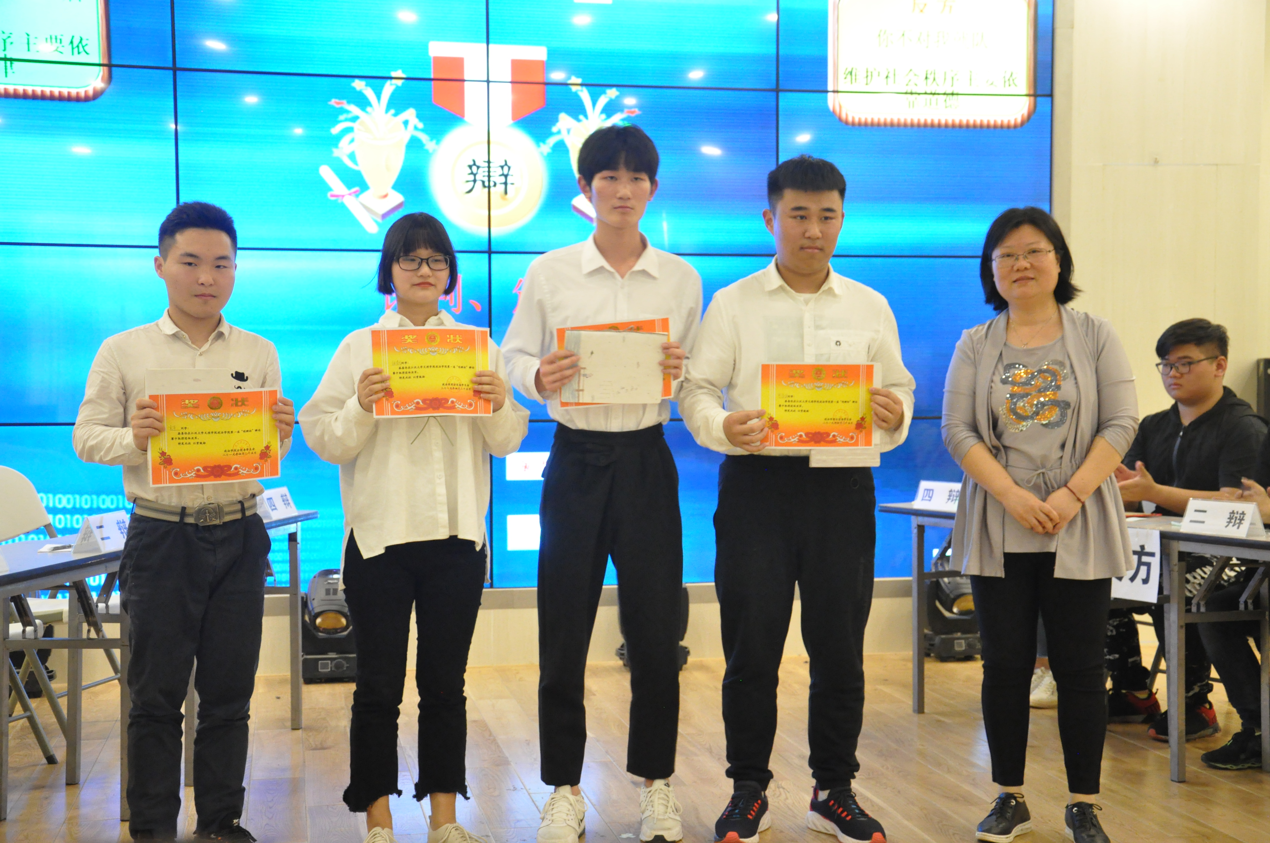 在经过评委客观地打分后,统计结果很快出来了,最后,正方四辩和反方三辩获得了“最佳辩手”,由陈海峰老师颁发荣誉证书并合影留念。正方“李蔚老师全国粉丝后援队”赢得亚军,反方“你不对,我就队”夺得桂冠,他们分别由陈海峰老师,刘超老师、李蔚老师颁奖并合影留念。