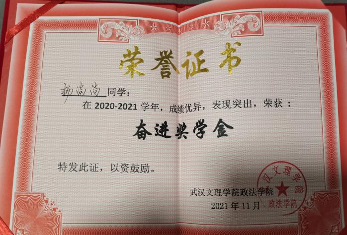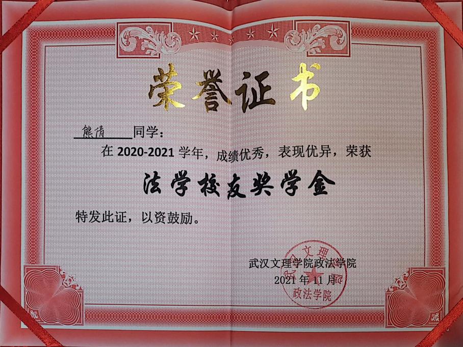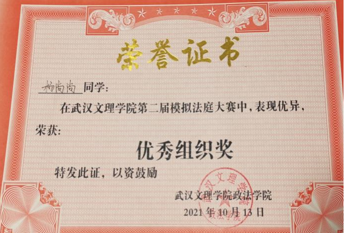 先后荣获“军训优秀学员”、“2019—2020年校级三等奖学金”、“第四届校内辩论赛冠军”、“湖北省第十三届挑战杯•中国银行老员工课外学术科技作品竞赛省赛三等奖”、“2020—2021年心理剧大赛一等奖以及最受观众喜爱奖”、“第一期文理法学读书会优秀组织者”、“2020-2021年奋进奖学金”、“学宪法,讲宪法知识竞赛一等奖”、“第二届模拟法庭大赛优秀组织奖”、“2021-2022年校级二等奖学金”等荣誉。