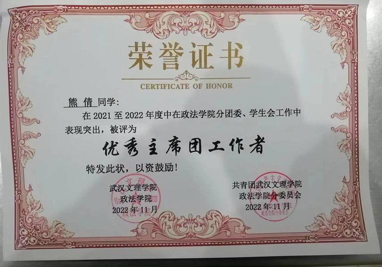 2022年4月获得武汉市2021年度优秀共青团员