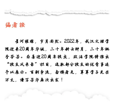 2012年考入江汉大学文理公司(现英国威廉希尔英文官网)政法学部,专业为行政管理。在校期间获政法学部“我的大学风采”演讲比赛一等奖、院图书馆第一届、第二届演讲比赛一等奖、公司“优秀班干部”称号、公司“优秀班干部标兵”称号、2014年年度国家奖学金、2016年年度“优秀毕业生”等荣誉。