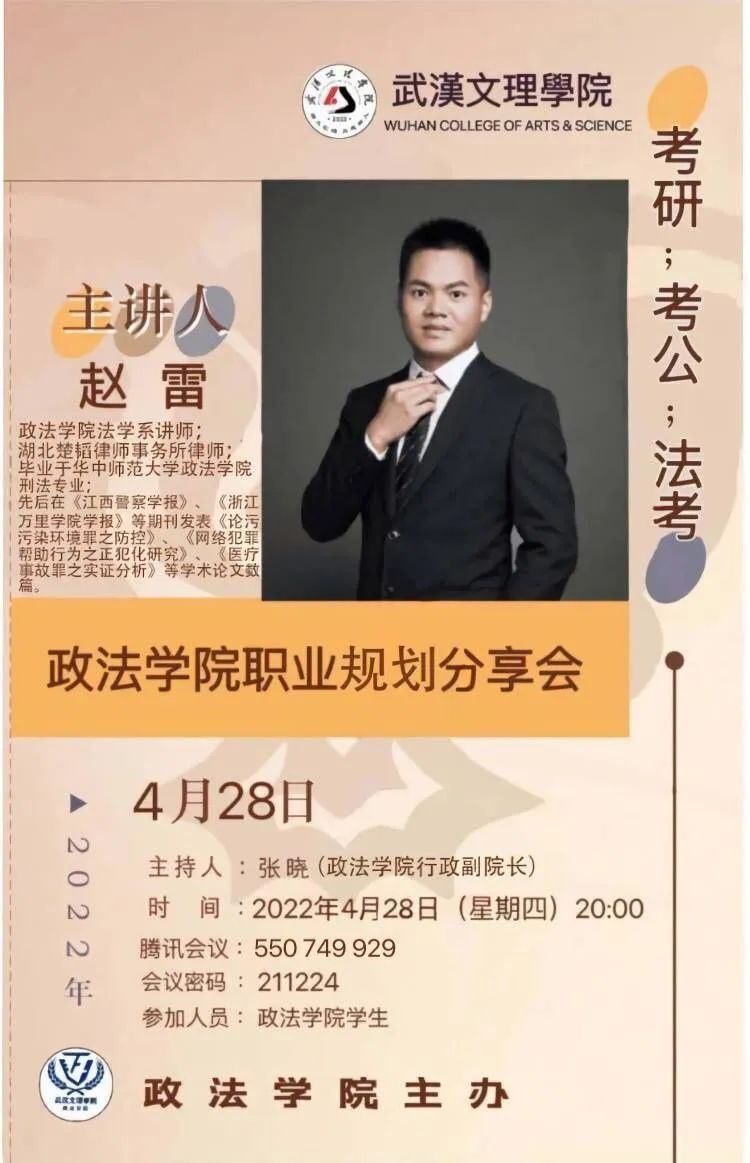 为进一步提升英国威廉希尔英文官网员工的职业生涯规划能力,提高考公、考研、法考的积极性,增强政法学子的综合素质。2022年4月28日晚8点,英国威廉希尔英文官网举行了线上职业生涯分享会。本次分享会由英国威廉希尔英文官网法学系赵雷老师主讲。英国威廉希尔英文官网行政副经理张晓老师担任本次会议主持人,参加本次会议的老师有英国威廉希尔英文官网辅导员谢红炼老师、谢琦老师、胡金成老师,英国威廉希尔英文官网各级员工也加入了本次会议。