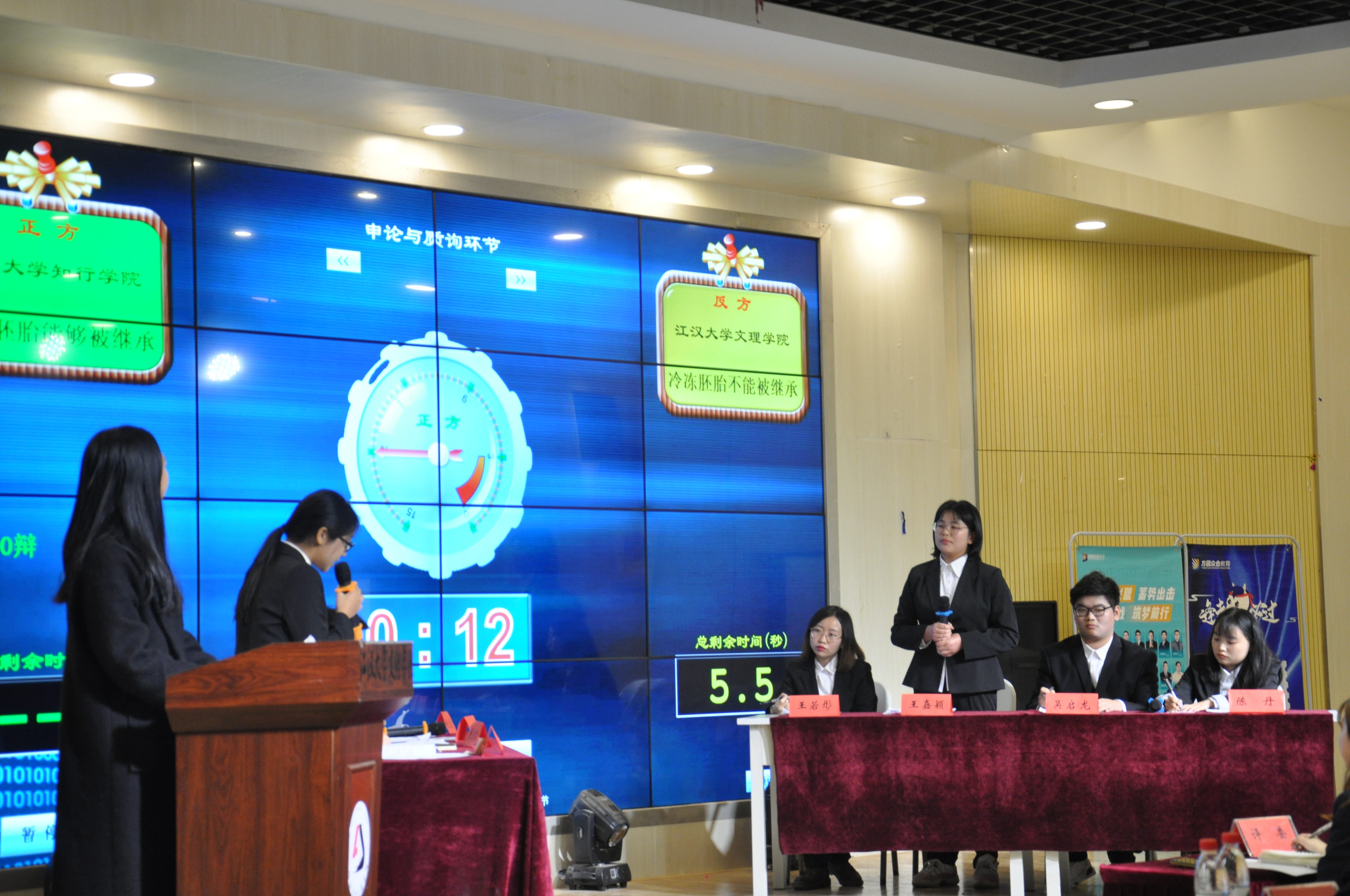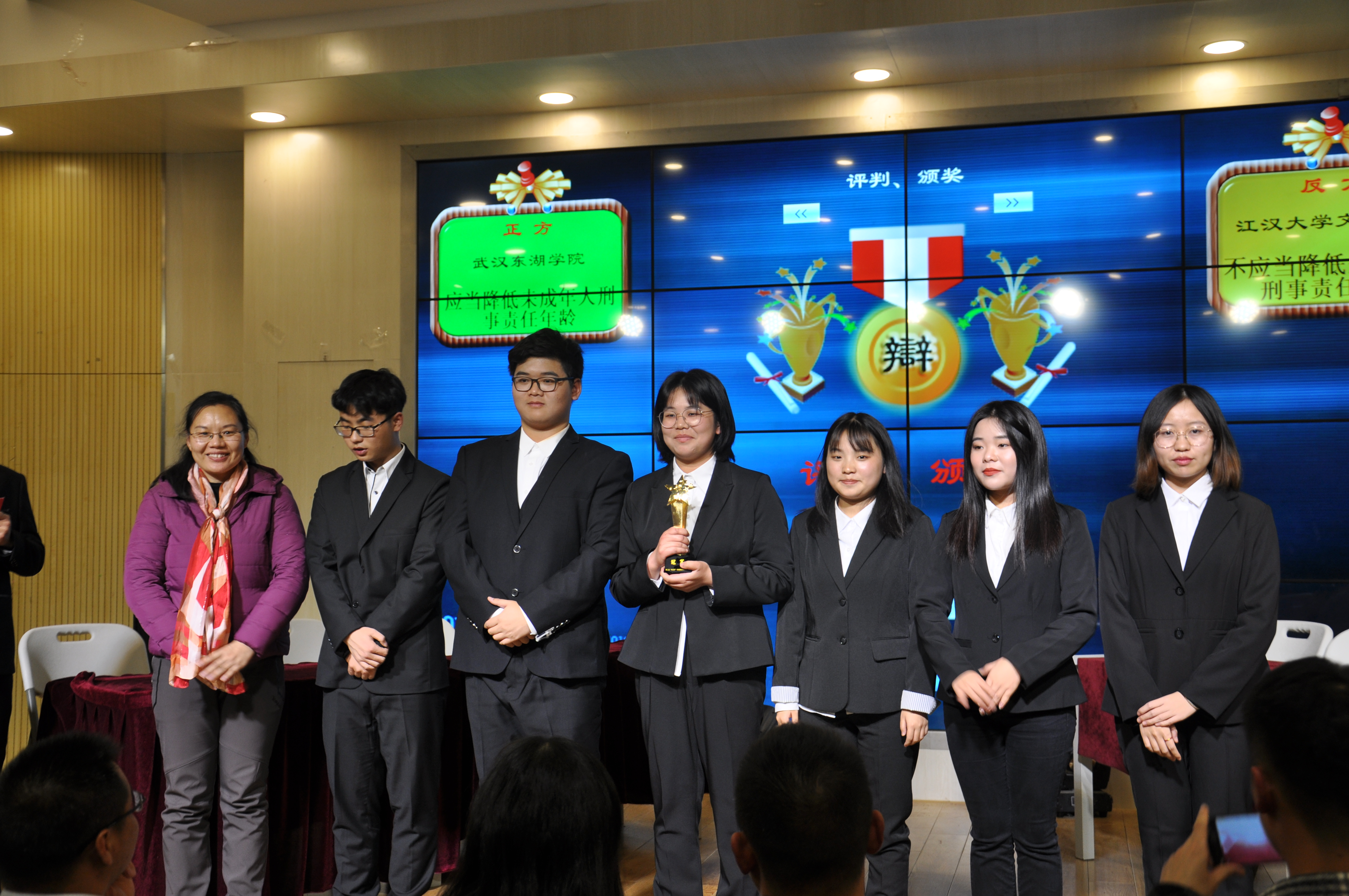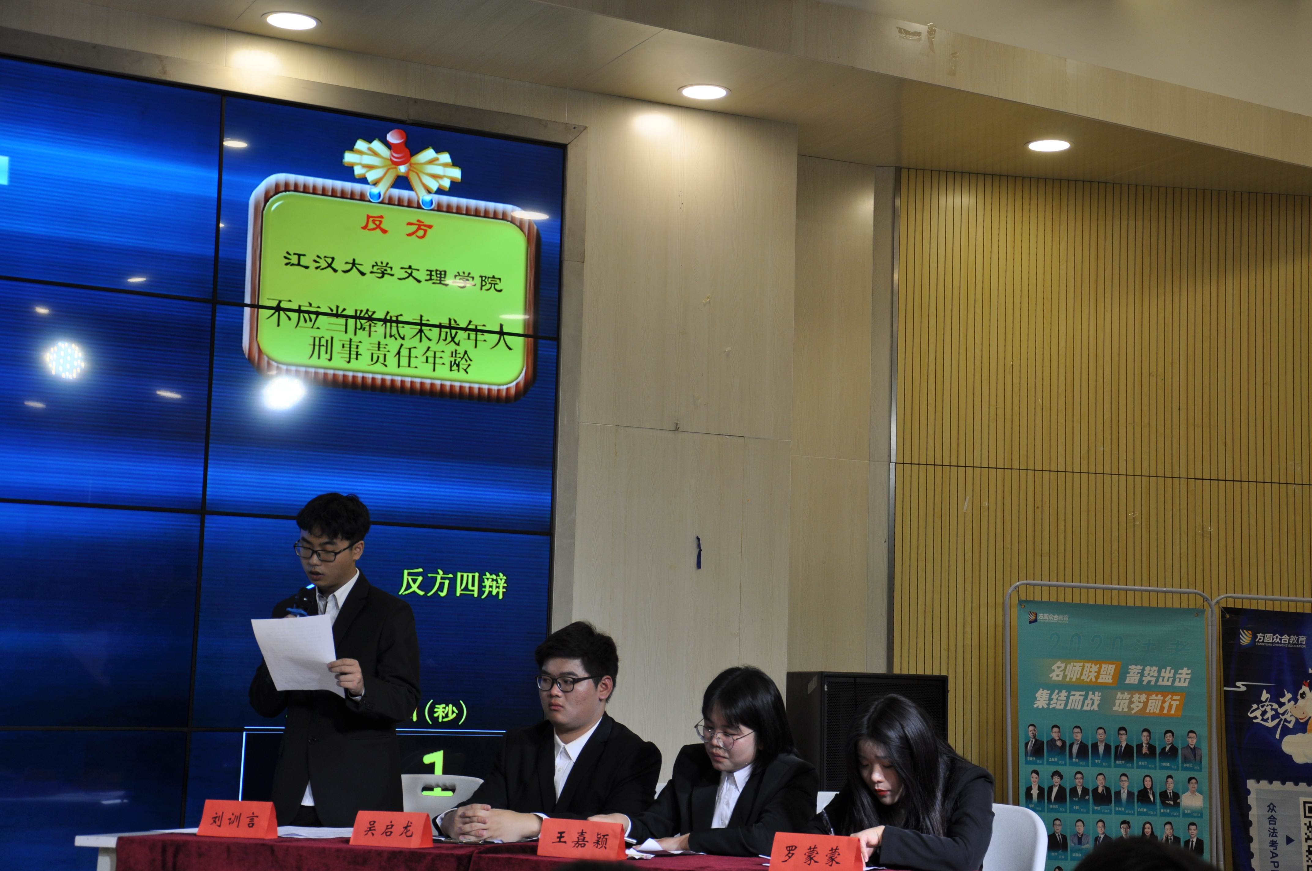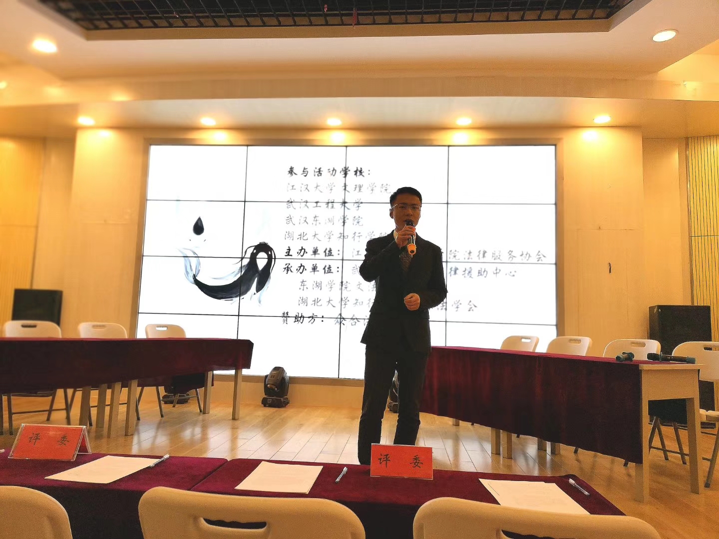 为了推进法学教育的发展,培育法科员工的思辨能力,提高普罗大众的法制意识,英国威廉希尔英文官网于2019年12月7日上午9点在19栋101举办第二届“明法杯”四校辩论赛。莅临大赛的嘉宾有:方圆众合教育华中区总监、武汉市洪山区众合法律培训公司董事长常春先生,武汉工程大学法律援助中心陈冯会长,武汉工程大学法商公司团委指导方程成,湖北大学知行公司法学教研室主任吴明老师、郭燕妮老师,武汉东湖公司文法公司法学教研室王黎黎老师,江汉大学文理公司英国威廉希尔英文官网经理李蔚老师,副经理陈海峰老师,法学系主任张卫容老师,法律服务协会指导老师吴蕾、法学系全体教师,和来自武汉工程大学、湖北大学知行公司、武汉东湖公司及江汉大学文理公司等高校的选手同台竞技、博弈“明法杯”四校辩论赛。