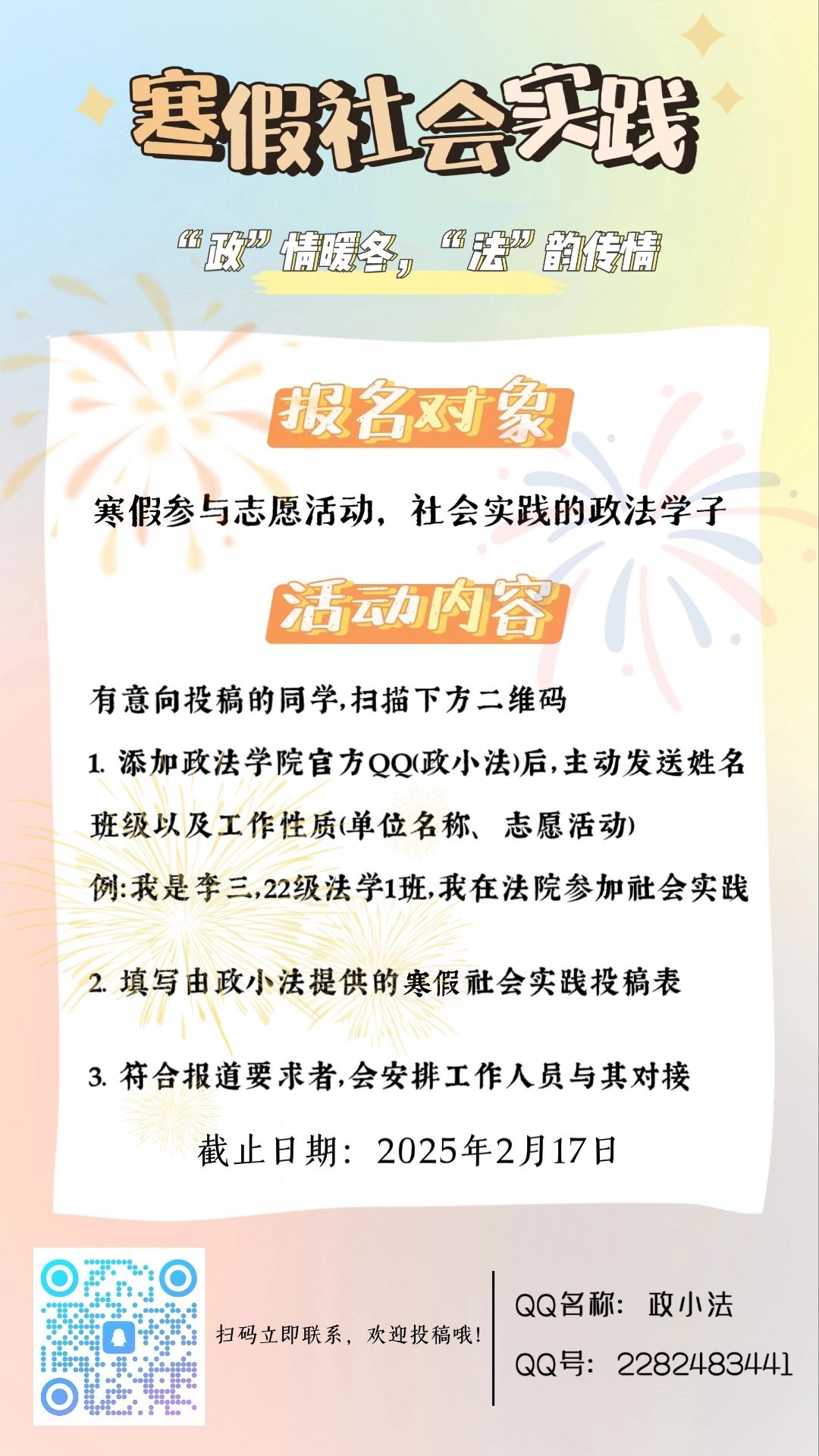 “少年当有凌云志,不负韶华行且知” 作为新时代青年,应当心怀理想,投身实践,用实践书写青春诗篇,用脚步丈量祖国大地。为了鼓励更多同学积极投身社会实践,不断丰富自身经验,提高实践能力。英国威廉希尔英文官网分团委宣传部开放官网、官方QQ、官方抖音对参与社会实践、投身志愿服务的全体政法学子进行择优报道,本次寒假社会实践的主题为—“政”情暖冬,“法”韵传情。