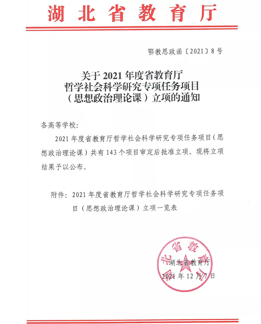 近日,根据《关于2021年度教育厅哲学社会科学研究专项项目(思想政治理论课)立项的通知》(鄂教思政办函〔2021〕8号)精神,在各大高校自主申报的基础上,经专家匿名评审、综合考核,2021年度湖北省教育厅哲学社会科学研究专项任务项目(思想政治理论课)共有143个项目批准立项。
