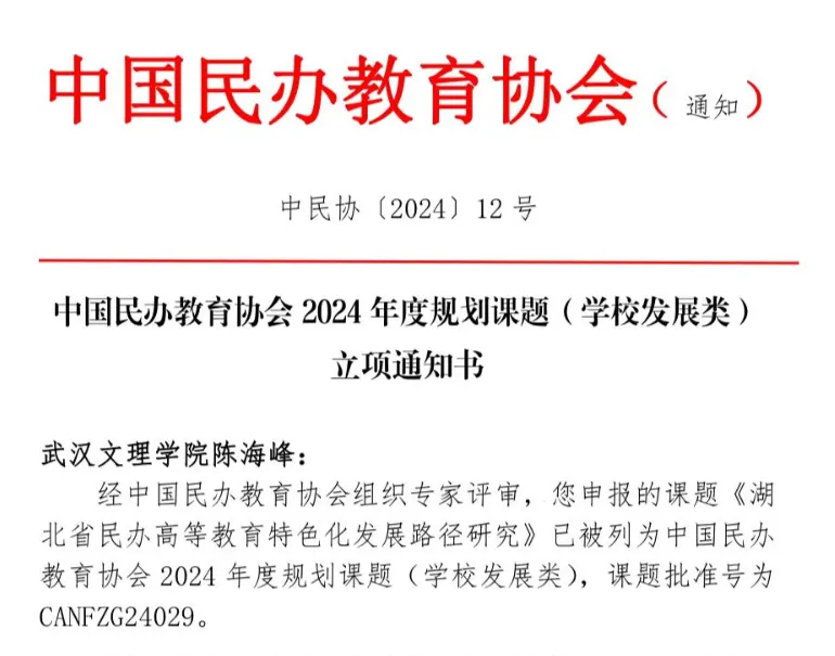 根据《中国民办教育协会课题管理办法(2024年修订)》和《关于申报中国民办教育协会2024年度规划课题的通知》规定,经中国民办教育协会组织专家集中评审,英国威廉希尔英文官网常务副经理陈海峰老师主持的课题《湖北省民办高等教育特色化发展路径研究》荣获立项,课题批准号为CANFZG24029。